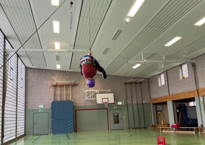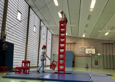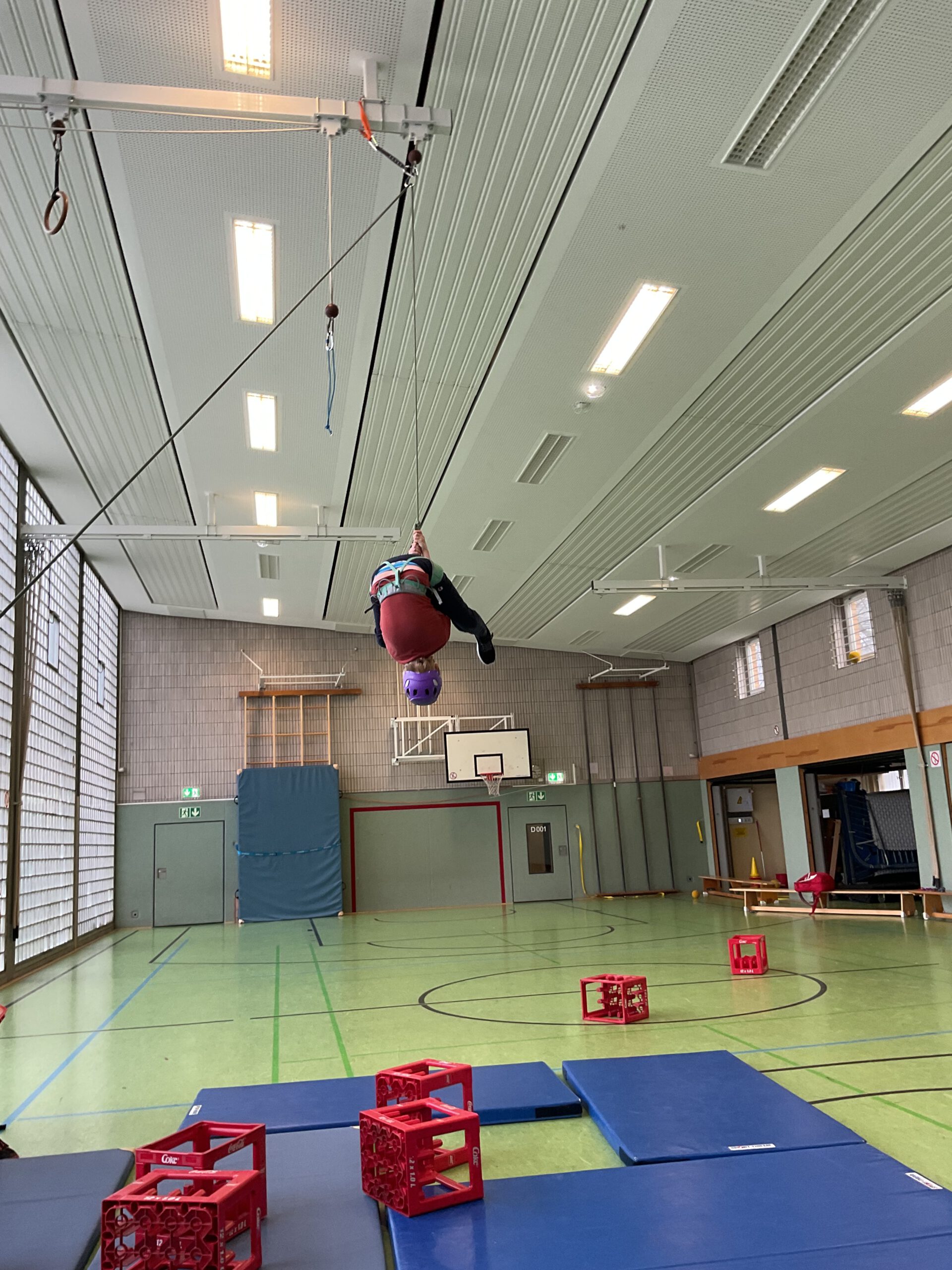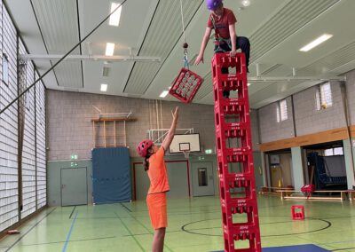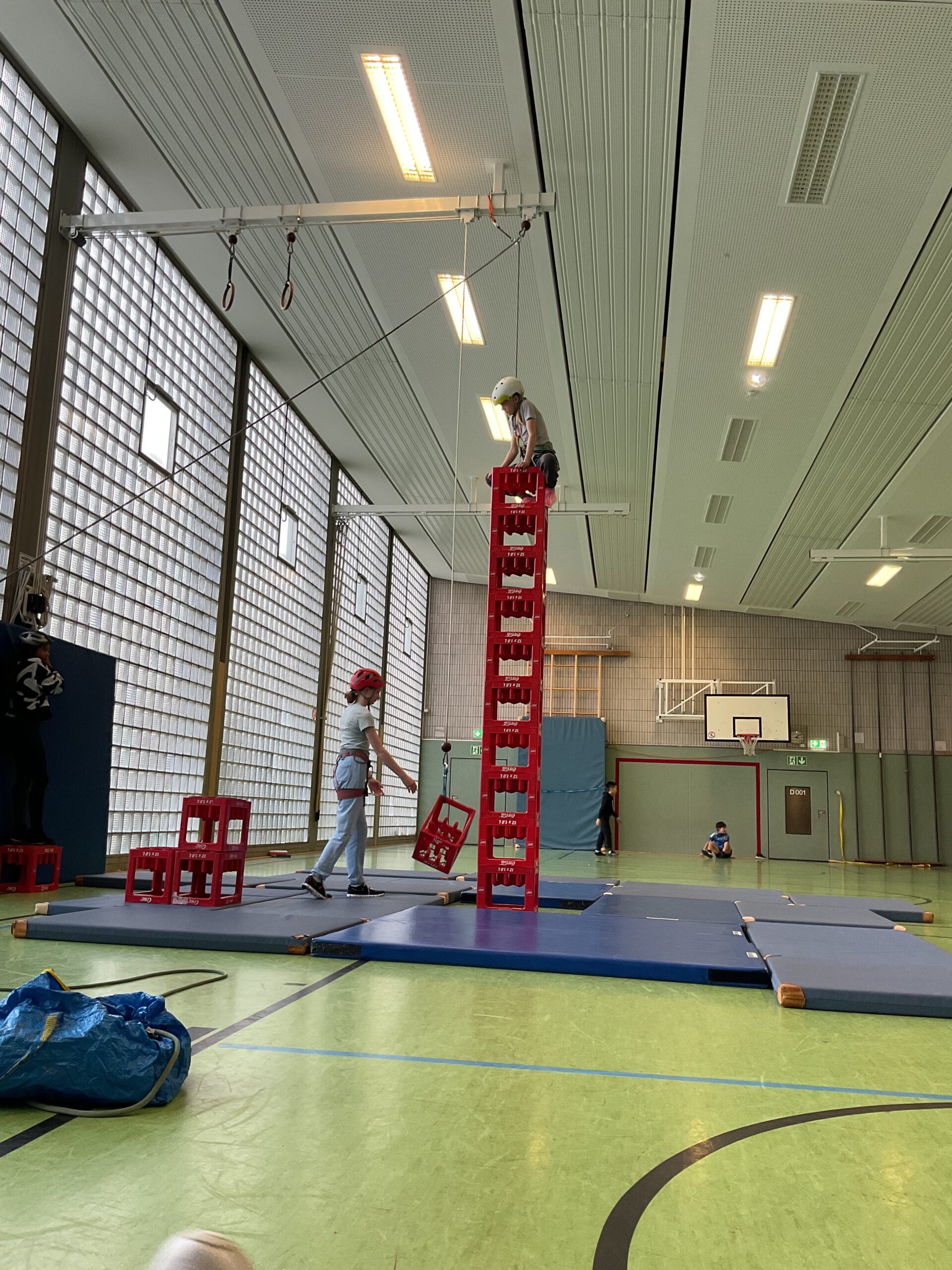 Da man beim Bouldern bekanntlich nicht so in die Höhe klettert, haben sich die Schüler*innen  am Mittwoch vor Weihnachten einer kleinen Herausforderung gestellt. Colakisten-Klettern. Dabei stapelt man Colakisten übereinender und klettert gleichzeitig an dem gebauten Turm hinauf. Je mehr Kisten man stapelt, desto höher und wackeliger wird es. Das geht so lange gut, bis der Turm kippt… und man fällt. Natürlich ist man über ein Seil gesichert. Manche der Schüler*innen haben es  tatsächlich bis zur Sporthallendecke geschafft.