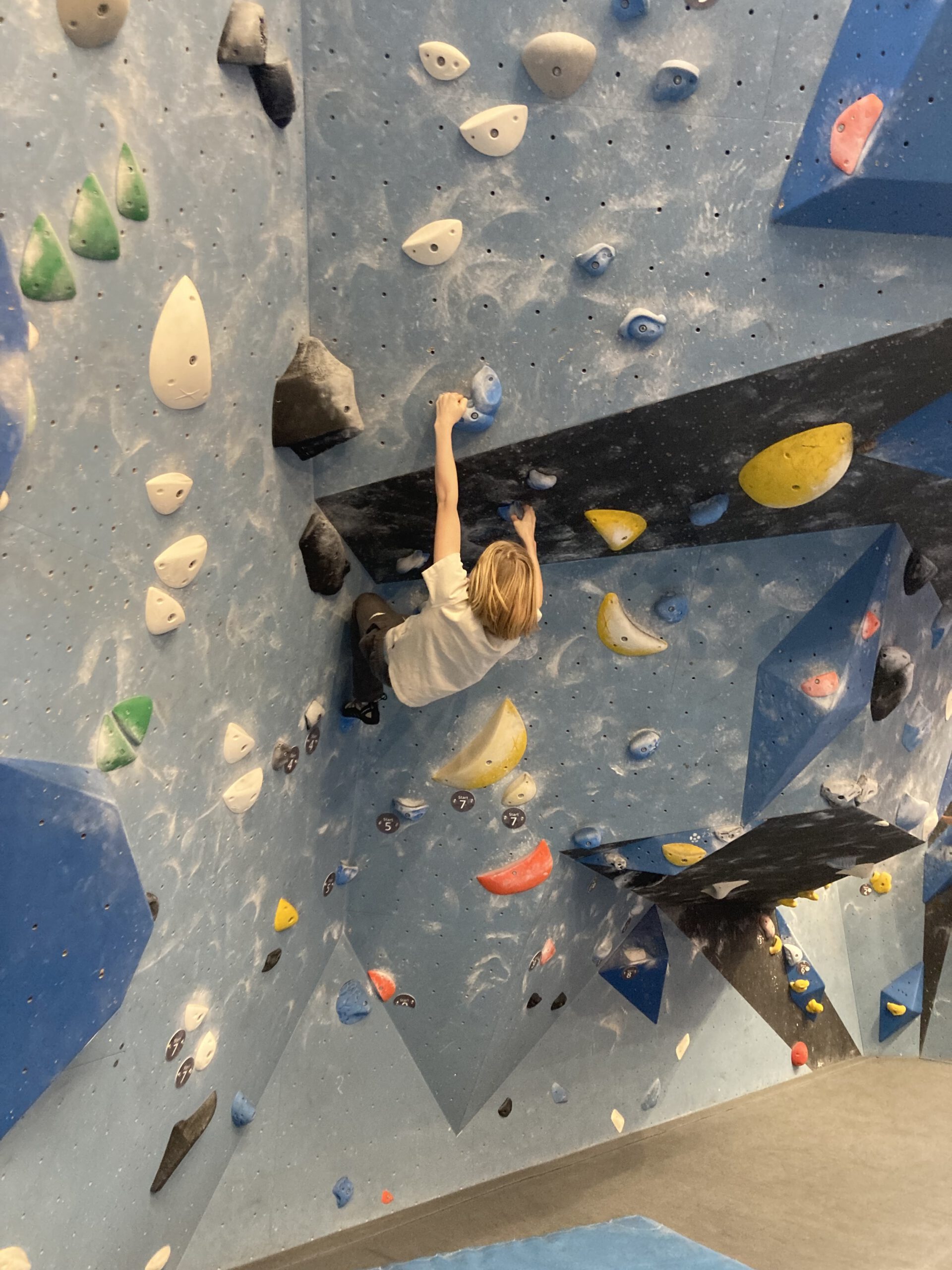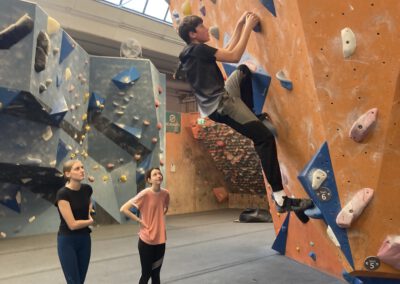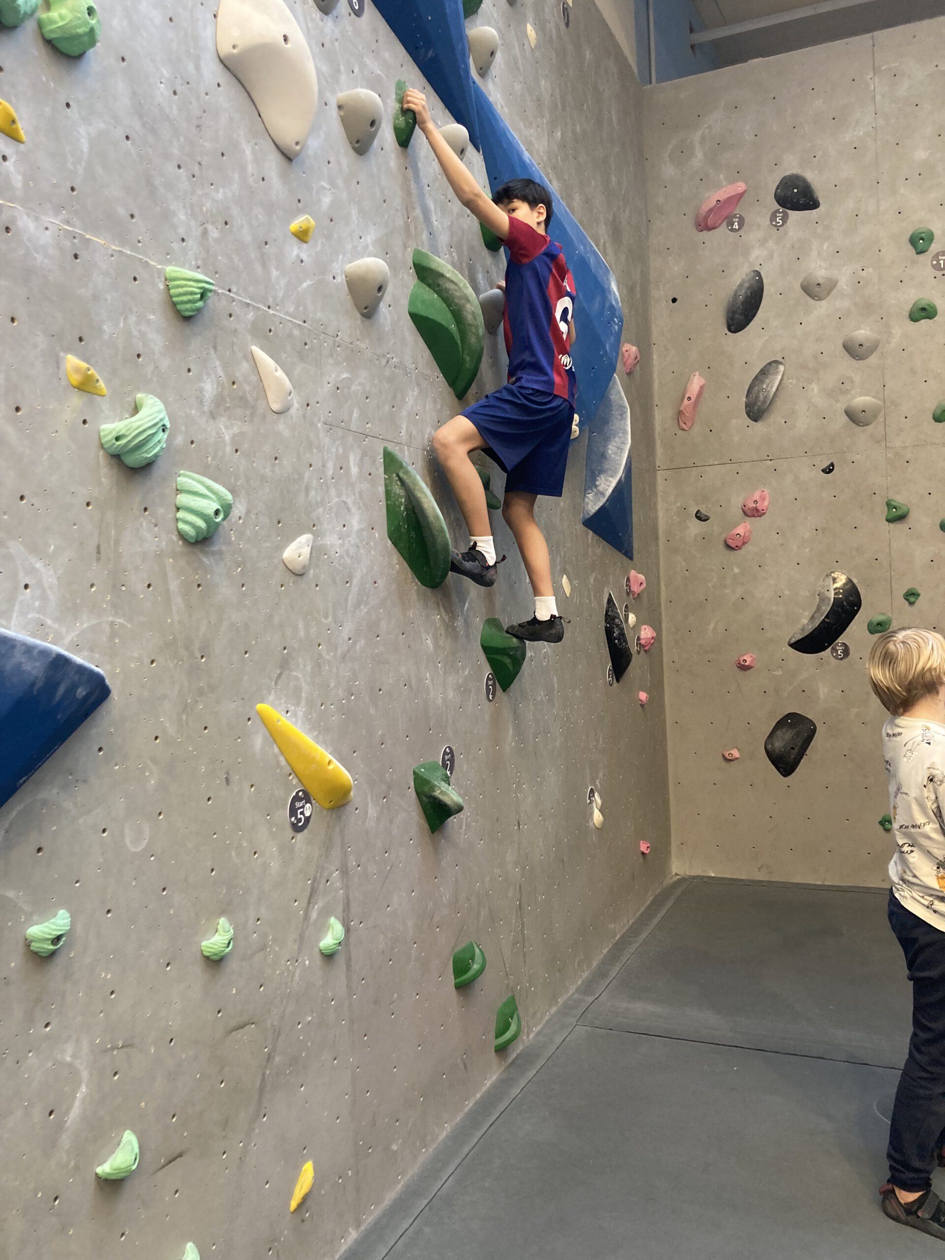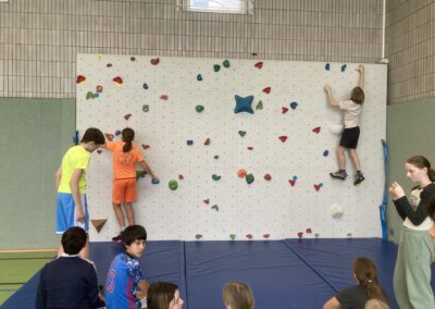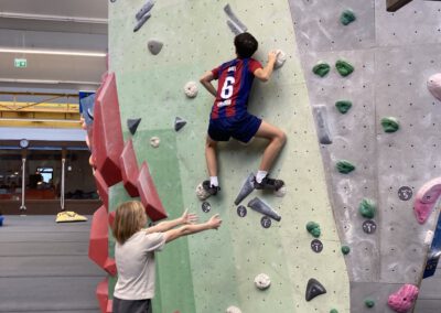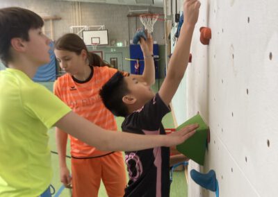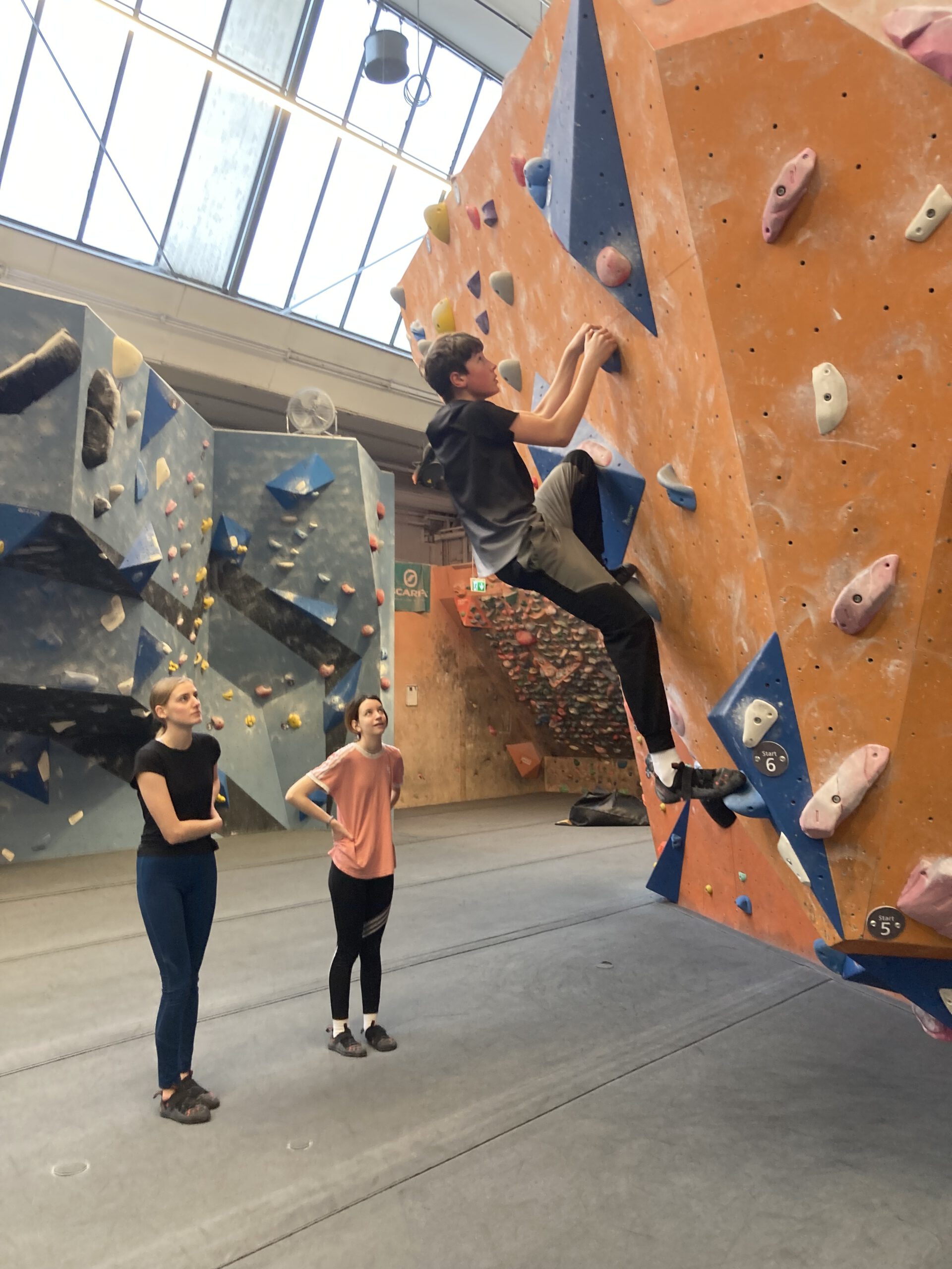 Zum Abschluss des Mittwochprojekts „Bouldern“ durfte ein Ausflug in eine Boulderhalle natürlich nicht fehlen. In Kleingruppen erkundeten die Schüler*innen die fast leere Boulderhalle und konnten sich an unterschiedlich schweren Routen ausprobieren. Von ganz schön hohen „HighBalls“ bis hin zu kniffligen Fingerrouten und Überhängen war alles dabei. Da konnte unsere kleine Wand in der Turnhalle natürlich nicht ganz mithalten. Zum Abschluss haben dann noch alle zusammen Versteck-Fangen in dem Kinderteil der Halle gespielt, wobei unser Sportlehrer Luiz die Kids durch ein Burglabyrinth gejagt hat. Er hatte keine Chance. 🙂